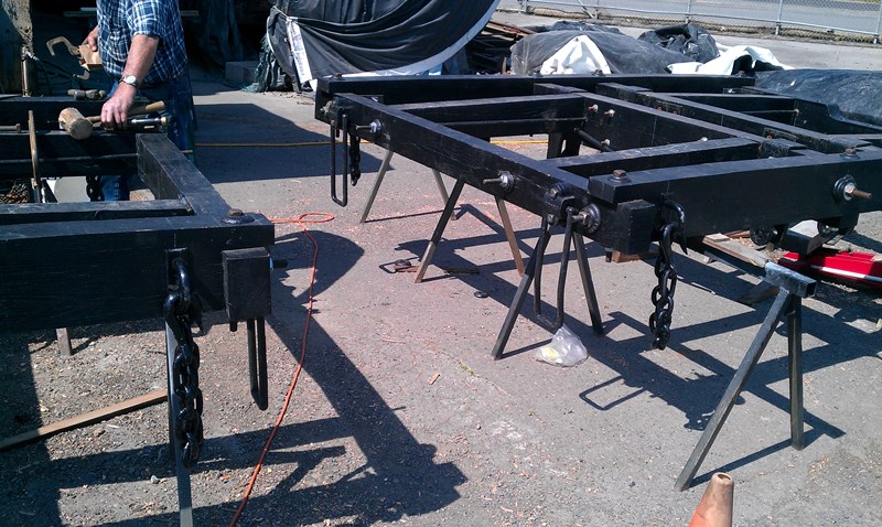The truck frames are finally assembled using new and recycled bolts and tie rods. With the exception of the pedestals, wheel sets and brake gear, all hardware that can be bolted to the frames has been added. We must wait until the pedestals are cast before assembly can proceed.