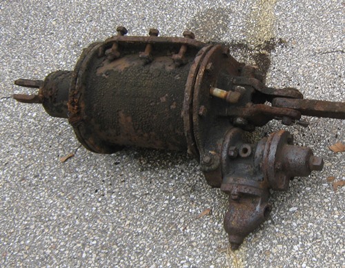 The WABCO Quick-action automatic brake system salvaged from B&O 20 includes the following components: a brake cylinder, 10 inches in diameter and 14″ in length with a stroke of 8″; auxiliary air reservoir; triple valve; brake-pipe air strainer; air-brake safety valve; and self-locking angle cocks, with hoses and couplings. These components are connected by 1¼” steel pipe. We did not get a conductor’s valve; that item stayed in Baltimore with the interior fittings.