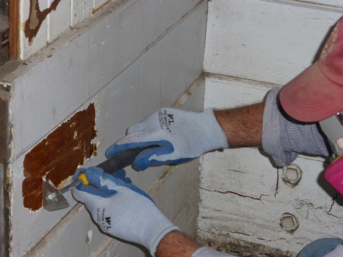 The triple valve that was sent to Pittsburg for rebuilding, was returned without repairs having been made. The shop was not able to find the necessary parts. We have a lead on another shop in Ontario, east of Los Angeles. The author is using the Speed Heater infrared lamp to remove the old paint from the end wall in the northeast corner of the car. The 1100-watt lamp softens paint in less than 40 seconds, allowing the paint to be scraped away and leaving nearly bare wood.