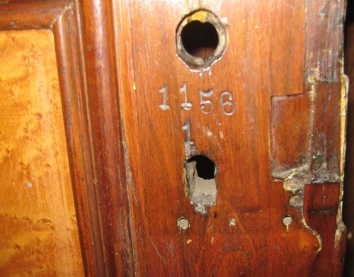 Charles and Dolores Hopkins of Santa Clara donated a wooden car door that had been salvaged many years ago from a MOW car at the Southern Pacific’s station at Radum, Alameda County. The detrucked car was used as an office and was slated for demolition when the door was rescued. The design and style of the door are identical to those of CP 29, indicating that the car was probably built by the Wason Manufacturing Company, too. Beneath the (missing) interior door latch the following numbers were stamped into the wood: “1156” and “1”. The “1156” identifies the car as CP 1156, while the “1” identifies it as Door #1. Central Pacific records now at the California State Railroad Museum show wooden coach 1156 was built by Wason and placed in service in September 1869. We have not yet located the original number for this car but will continue searching.