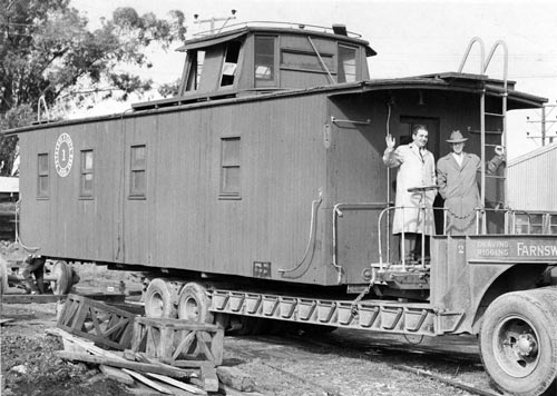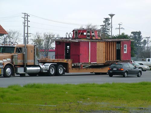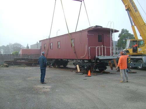 A picture from Frank Maffei shows the caboose in front of Colonial Drive-in in San Mateo. We do not know why it was parked there. It next turned up as an office for a used car lot along the El Camino Real in San Mateo. With CalTrain’s planned elevation of the tracks in the late 1980s, the used car lot was in the way. The caboose was saved and moved to a warehouse in Hunters Point, the home of the Golden Gate Railroad Museum. The museum was forced to leave Hunters Point when the Navy and the City of San Francisco decided to redevelop the area. That’s when the NWPRRHS stepped in and in January of 2005, the caboose was returned to Petaluma.